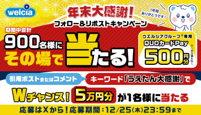 【X】フォロリポで900名様にウエルシアグループ専用QUOカードPay当たる!