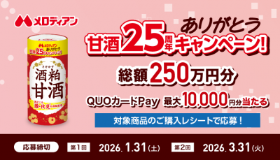 対象の甘酒を購入してWEBで応募すると、合計500名様にQUOカードPay当たる!