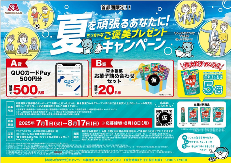 夏季の首都圏限定施策として、首都圏のスーパーで対象商品(森永製菓ラムネ5品)のうち2品を購入したレシートで応募し、抽選で以下賞品が当たるキャンペーン。