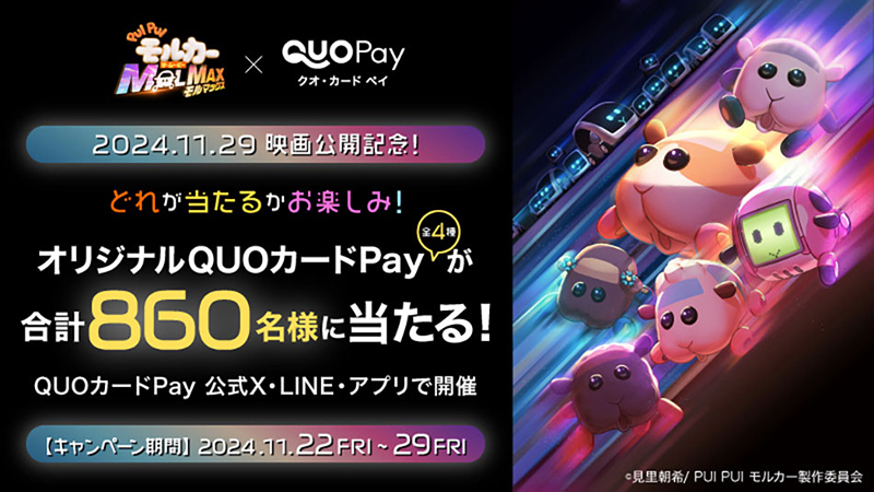 大人気ストップモーションアニメ「PUI PUI モルカー」の長編映画『PUI PUI モルカー ザ・ムービー MOLMAX』映画公開日に向けて、公開前にX(旧Twitter)・QUOカードPay公式アプリ・QUOカードPay公式LINEで以下の3つのキャンペーンを実施。