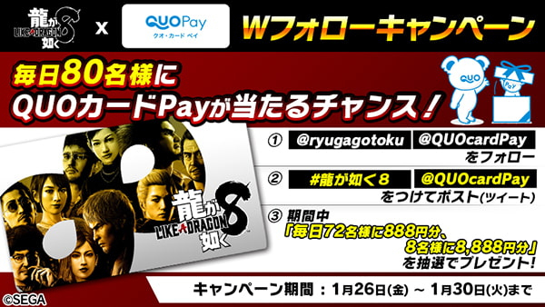 内容・参加方法:「龍が如くスタジオ」と「QUOカードPay」の公式アカウントをフォロー&指定のハッシュタグを記載してポスト