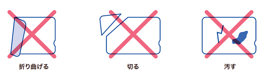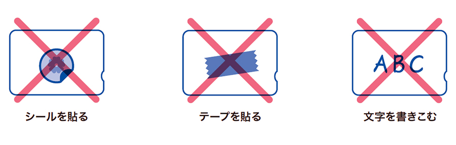 カードの表面や裏面に、シールやテープを貼ったり、ペンやマジックで文字を書いたりしないでください。