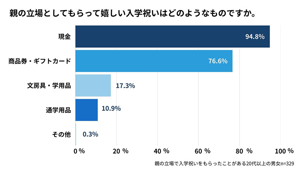 もらって嬉しい入学祝いについて聞いたところ、「現金」と回答した人は94.8%、「商品券・ギフトカード」は76.6%と高い割合となりました。
