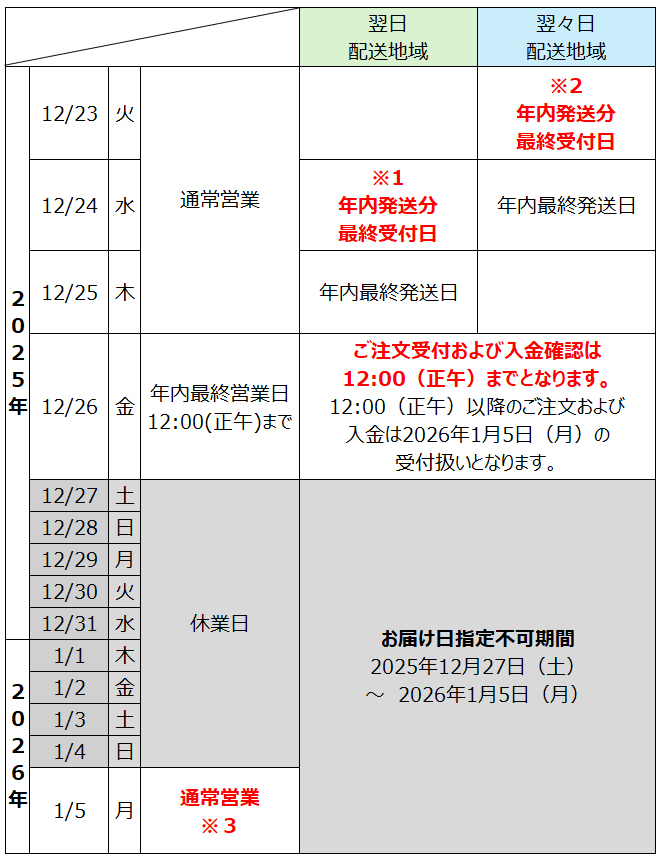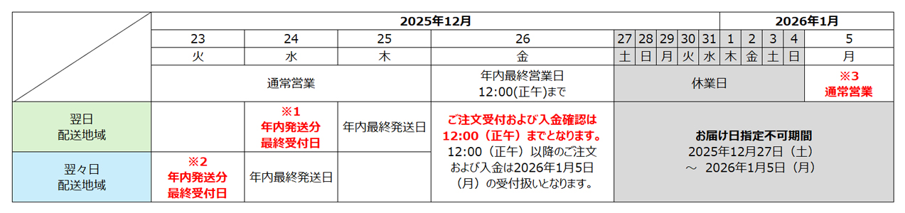 | ※1 年内発送分最終受付日(翌日配送地域) |