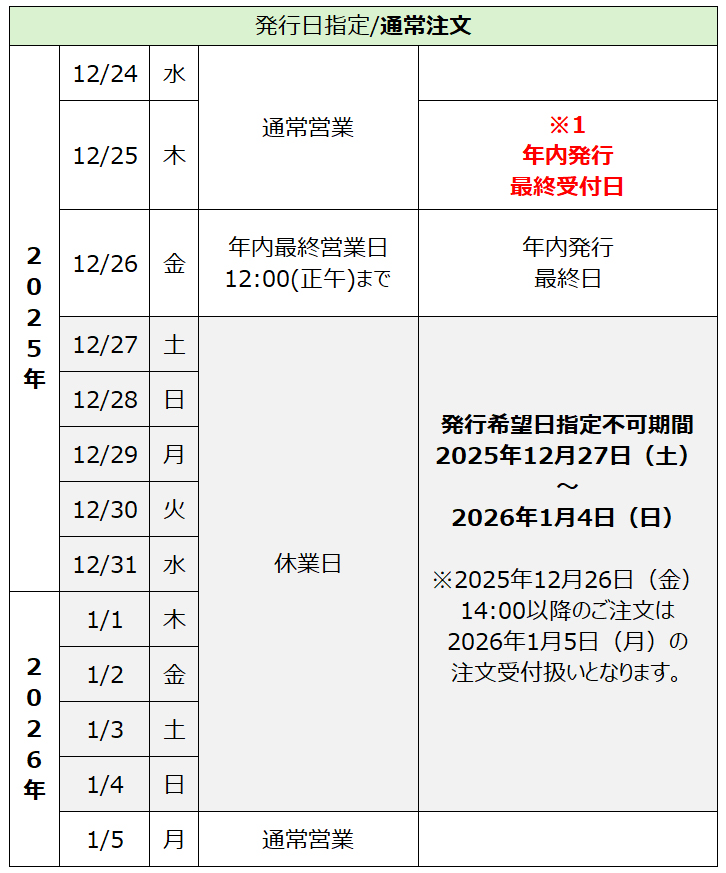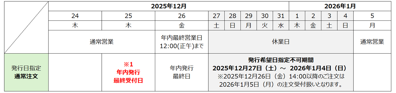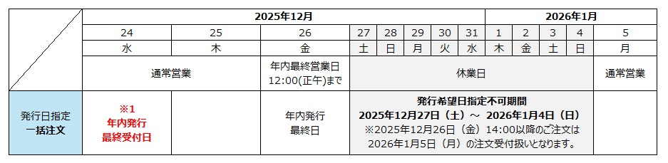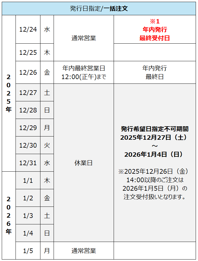 | 2025年12月24日(水)14:00以降のご注文につきましては、ご選択いただける発行希望日は2026年1月5日(月)以降となります。 |