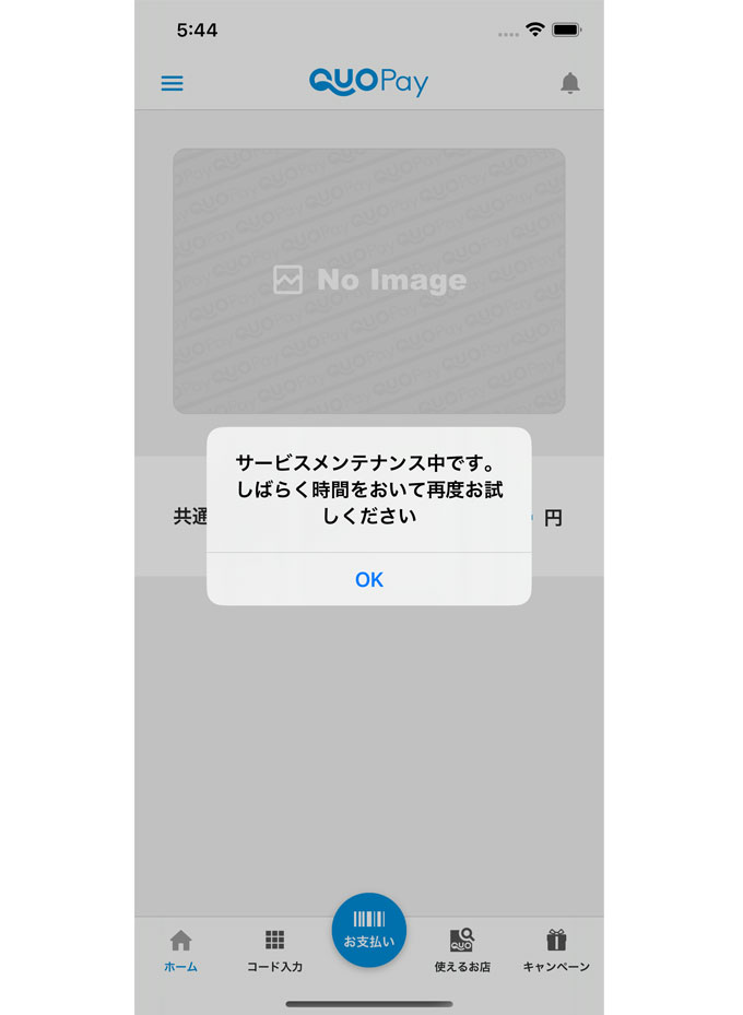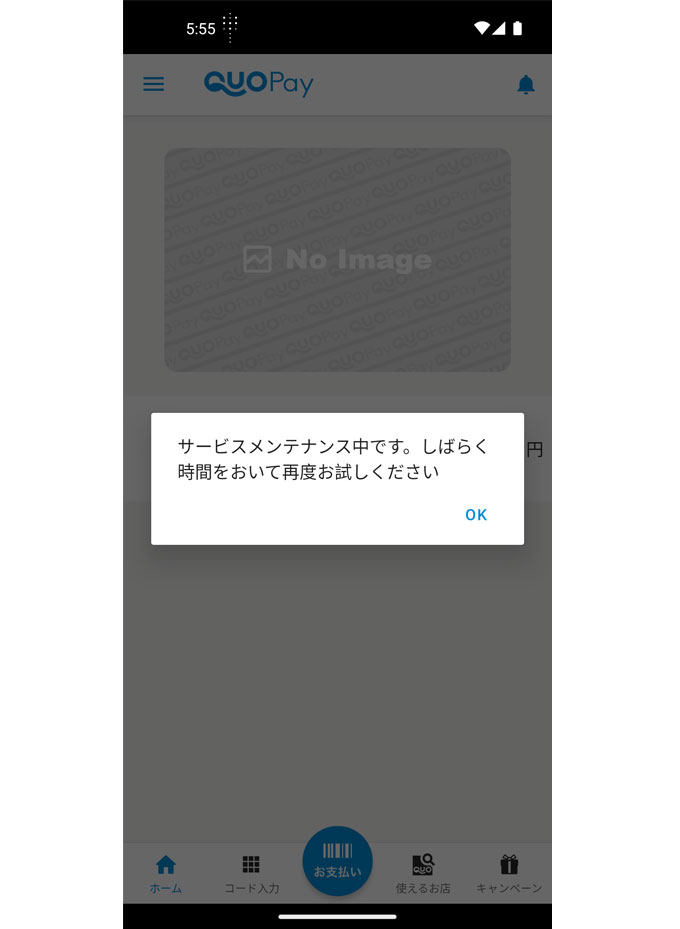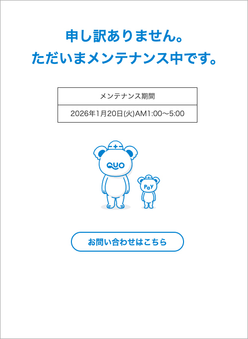 メンテナンス期間中は、アクセスすると「メンテナンス中です。」と表示され、「QUOカードPay」の店舗でのお支払いや、オンラインストアでのご注文・バリューコードのダウンロードなど、全てのサービスのご利用ができなくなります。