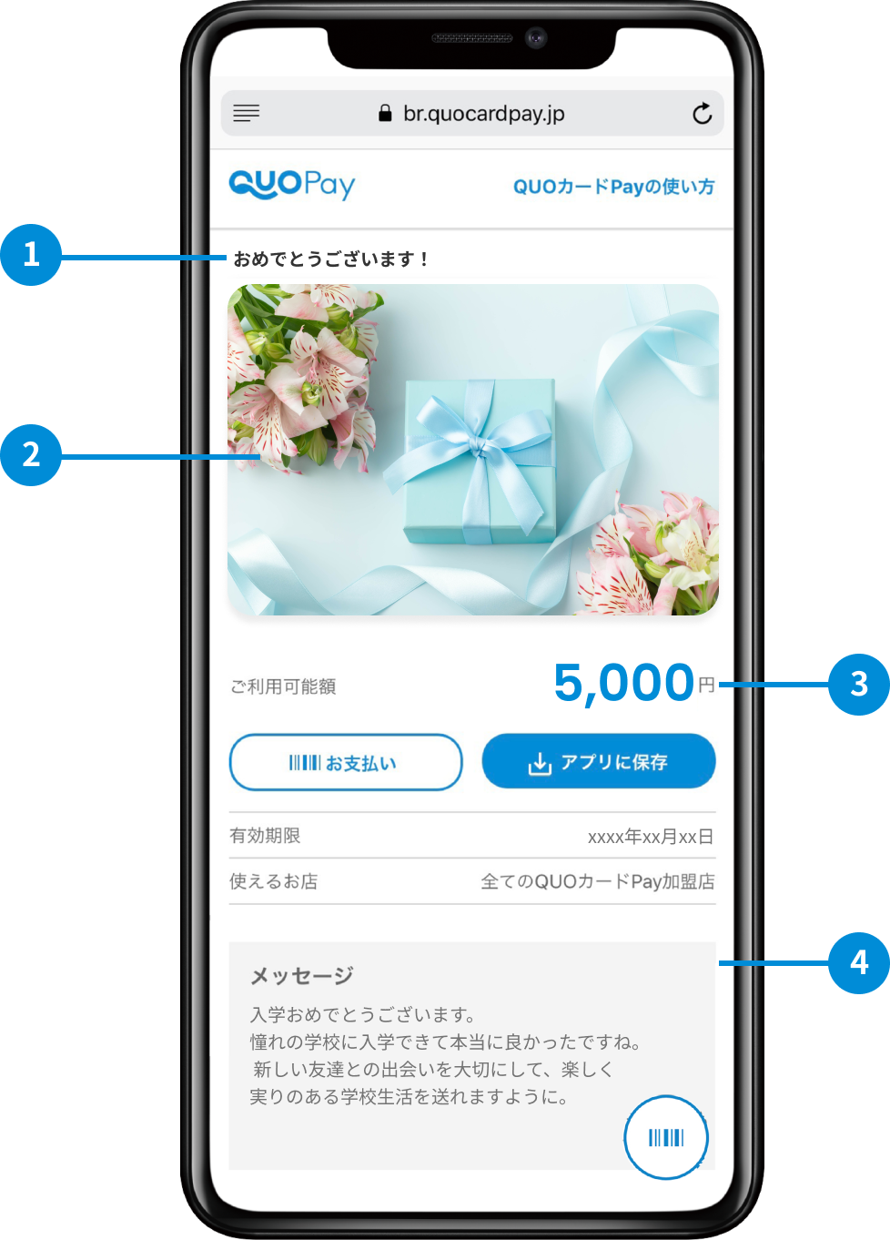 受け取った方がURLにアクセスするとQUOカードPayの画面が表示され、そのままお支払いに利用できます。専用アプリのインストールや会員登録といったわずらわしさなく使えて大変便利です。