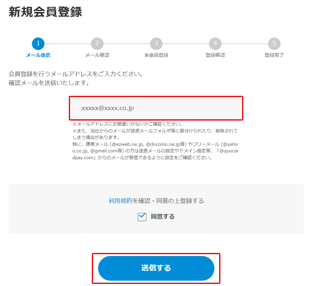 新規会員登録画面にて会員登録するメールアドレスを入力いただき、利用規約を確認・同意のうえ「送信する」ボタンを押下してください。