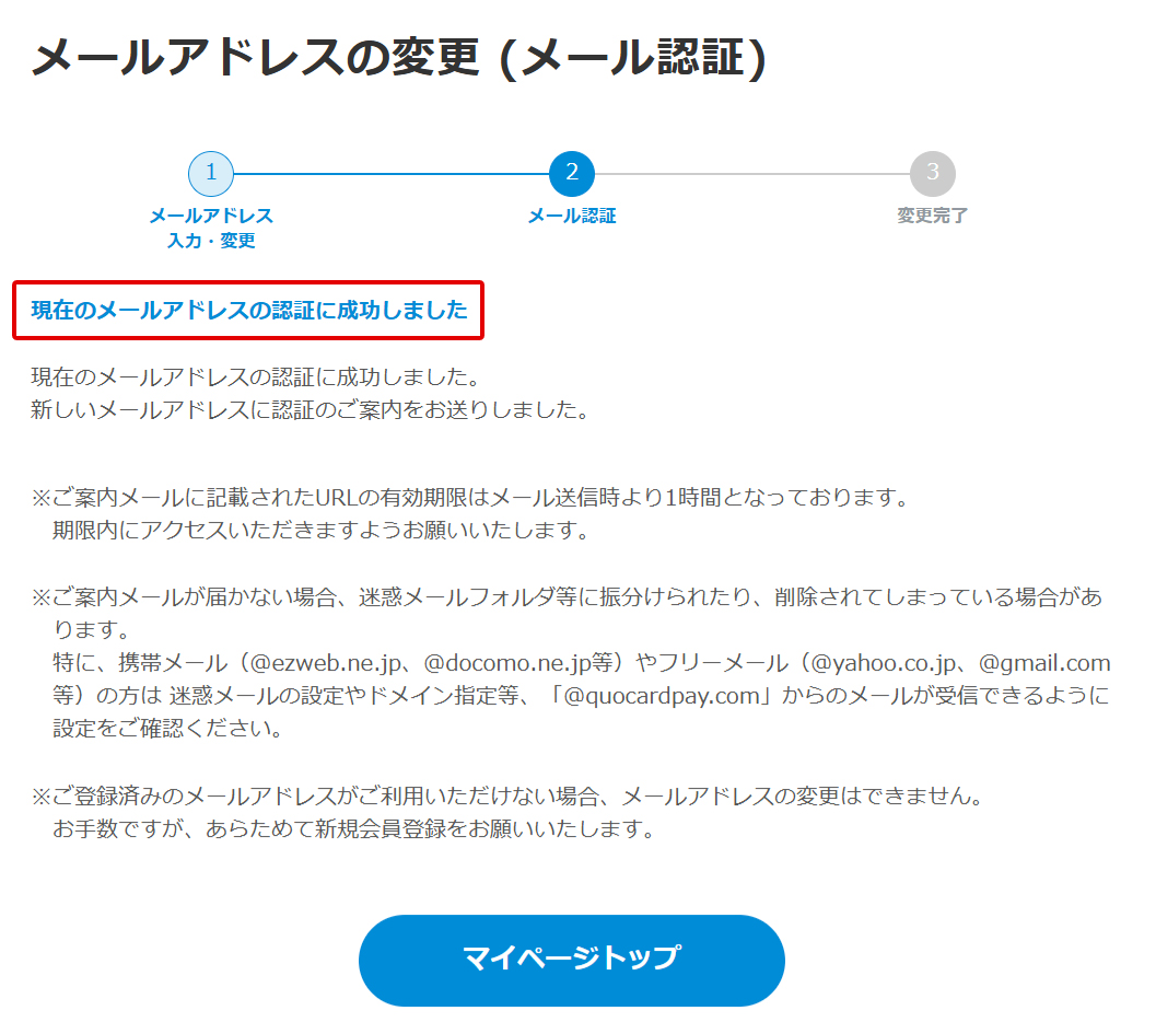 登録済みメールアドレスの認証に成功すると、新しいメールアドレス宛に「メールアドレス変更手続きのご案内」メールが送信されます。