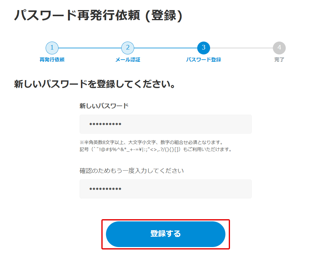 - 半角英数8文字以上、大文字小文字、数字の組合せ必須となります。