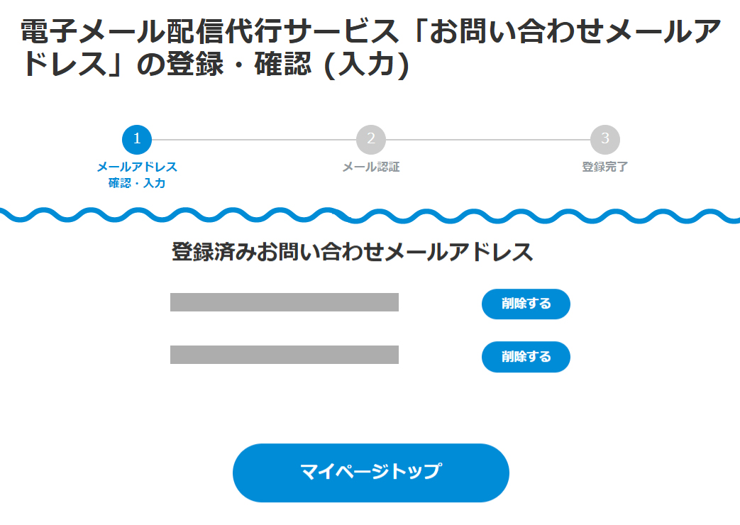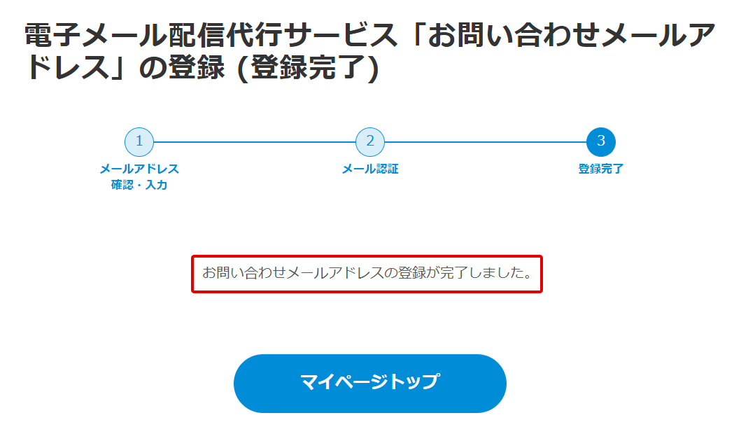 マイページ内「電子メール配信代行サービス「お問い合わせメールアドレス」の登録・確認」より、お問い合わせメールアドレスの登録・確認が可能です。