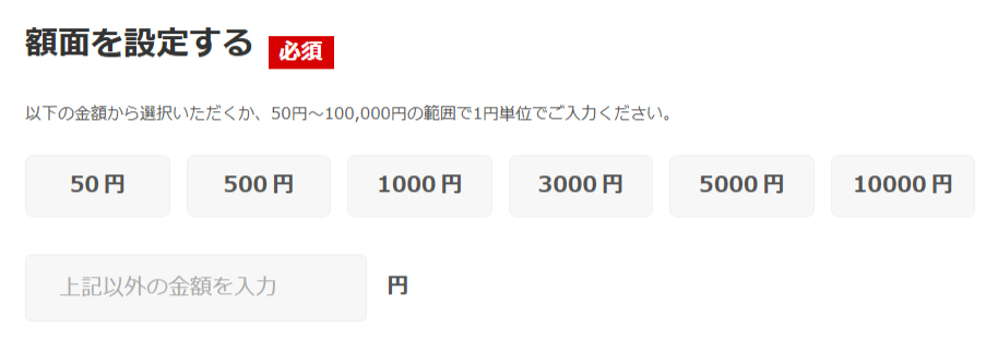 バリューコードの額面を、50円から10万円まで、1円単位で設定いただけます。