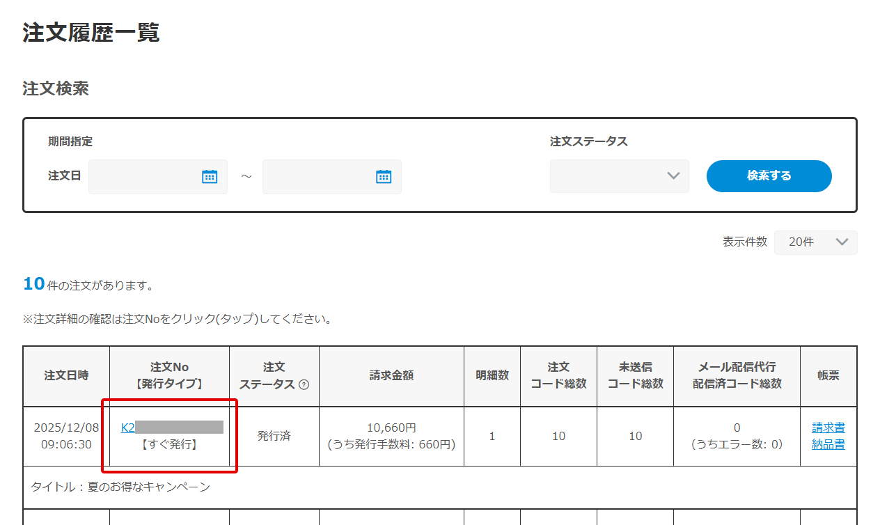 | メール配信日時 | 電子メール配信代行サービス利用時のみ、配信日時が記載されます。 |