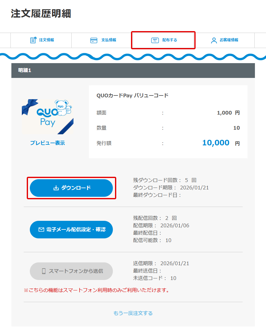 (2)取得・配布する明細の「ダウンロード」ボタンを押下