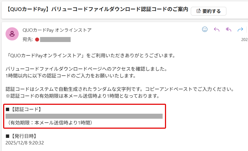 (4)会員登録アドレスに認証コードのご案内メールが届くので、認証コードをコピー