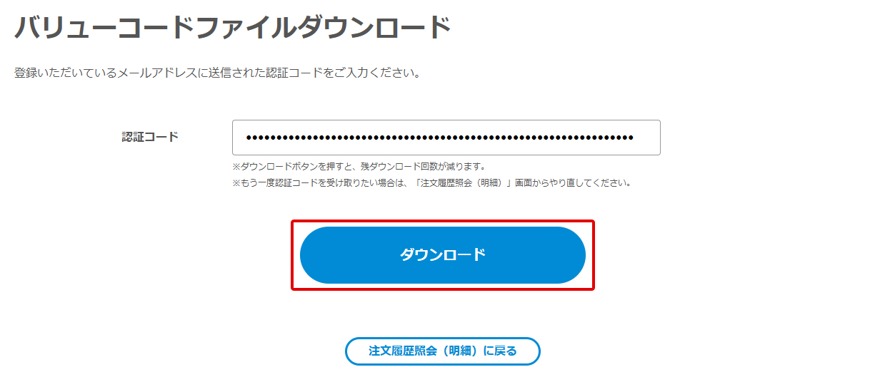 (5)ダウンロード画面に戻り、認証コードを貼り付けて「ダウンロード」を押下